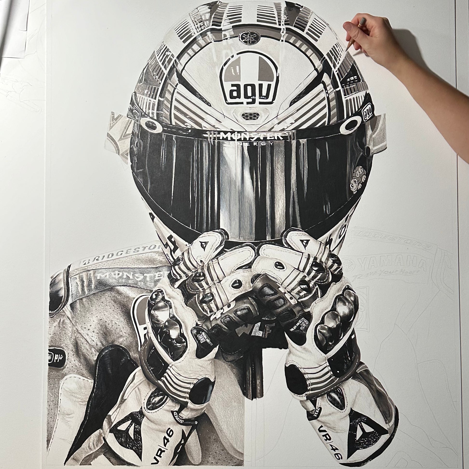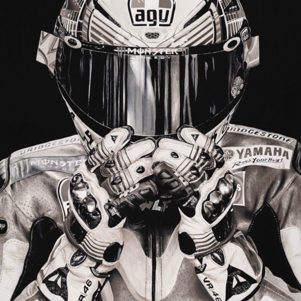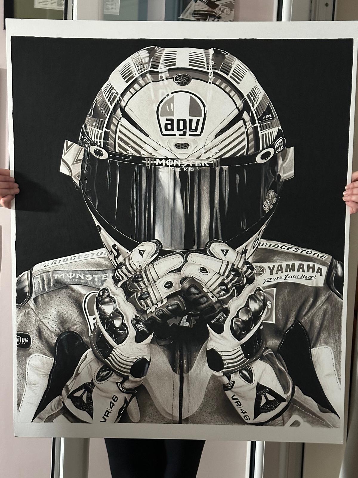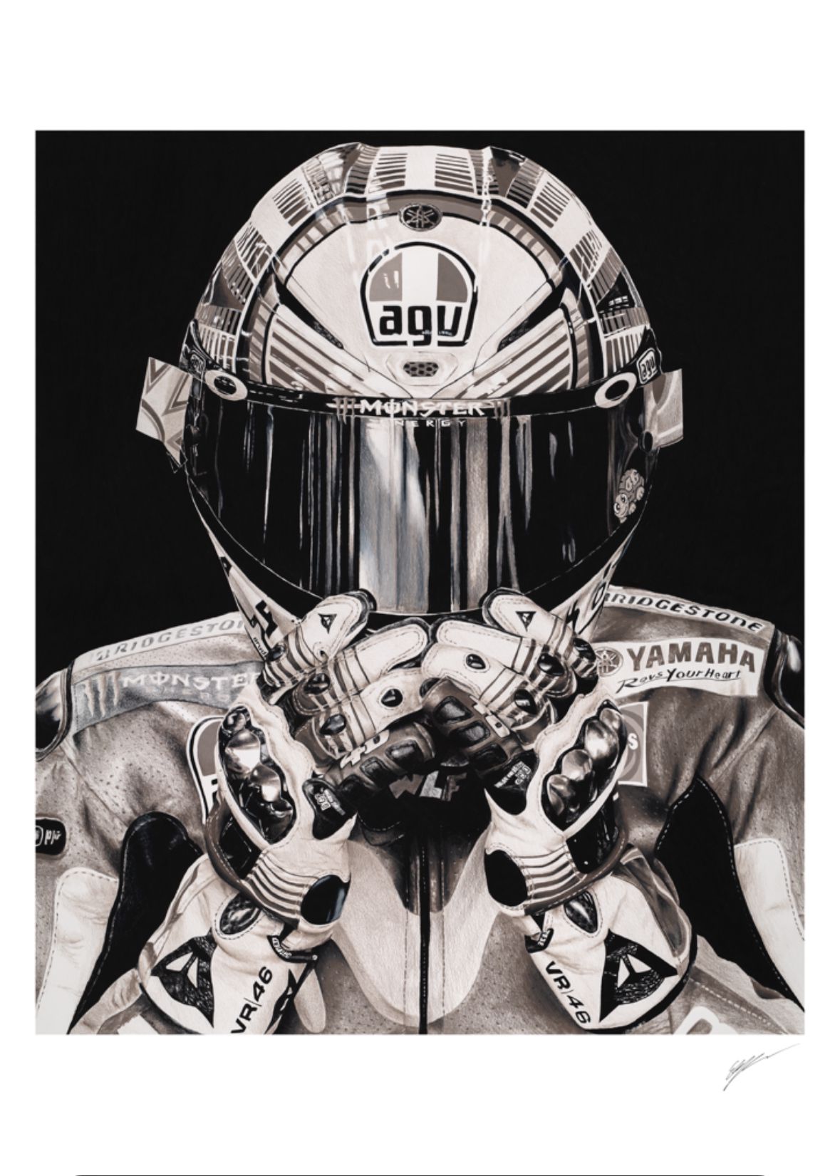 A Giclée Fine-Art Print of Emma's colour pencil drawing of motorcycle racing legend Valentino Rossi based on a photograph taken at Silverstone in 2015. Each limited edition print includes the artist signature, is numbered and comes with a certificate of authenticity.