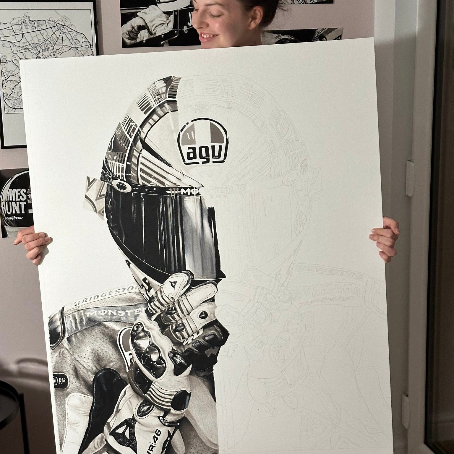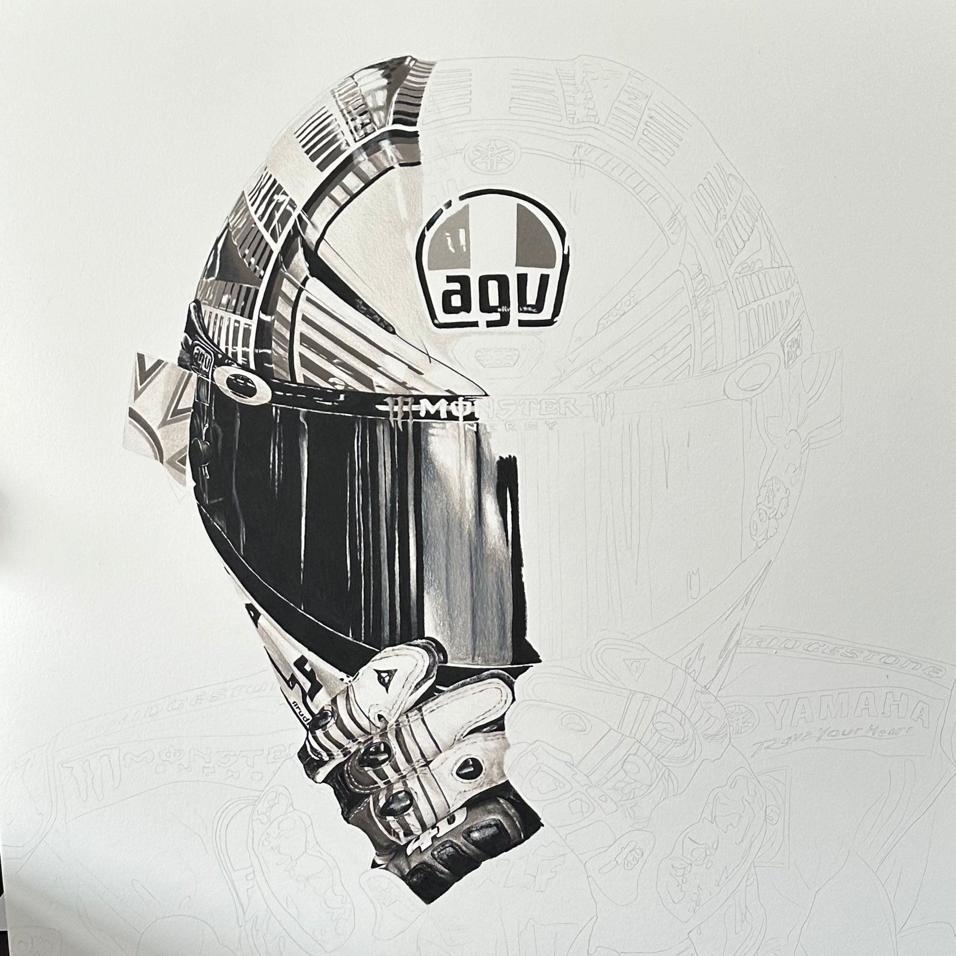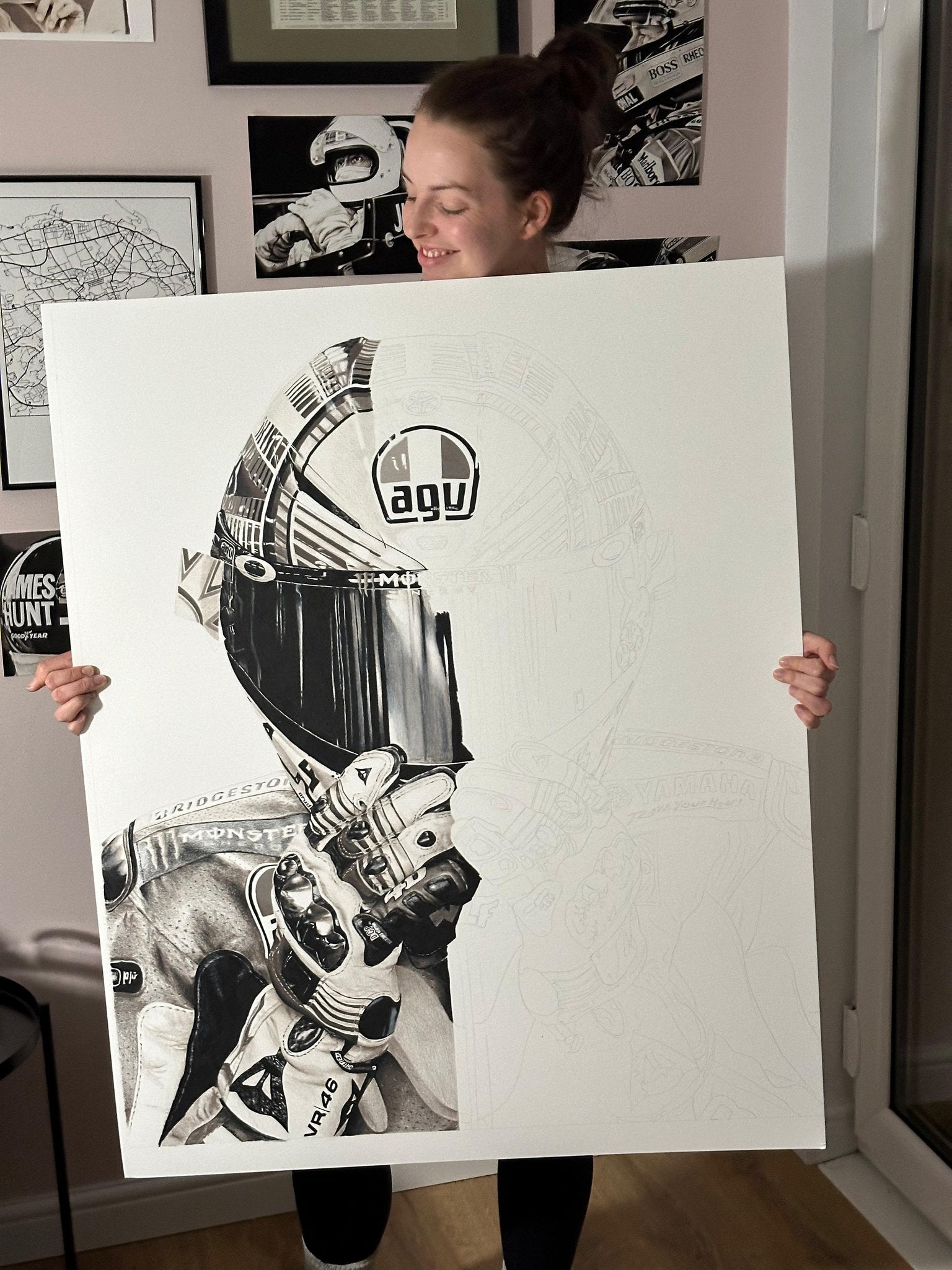 A Giclée Fine-Art Print of Emma's colour pencil drawing of motorcycle racing legend Valentino Rossi based on a photograph taken at Silverstone in 2015. Each limited edition print includes the artist signature, is numbered and comes with a certificate of authenticity.