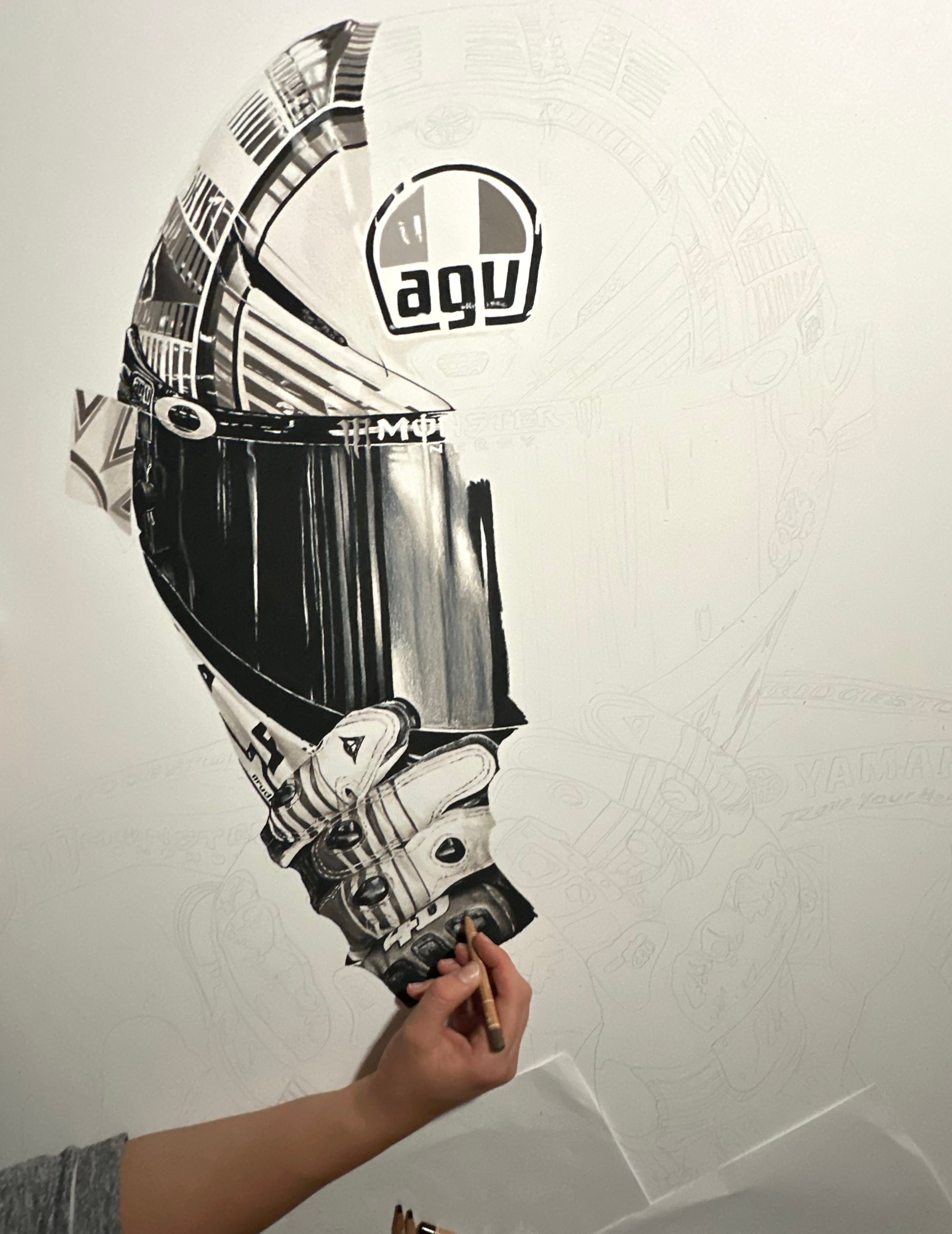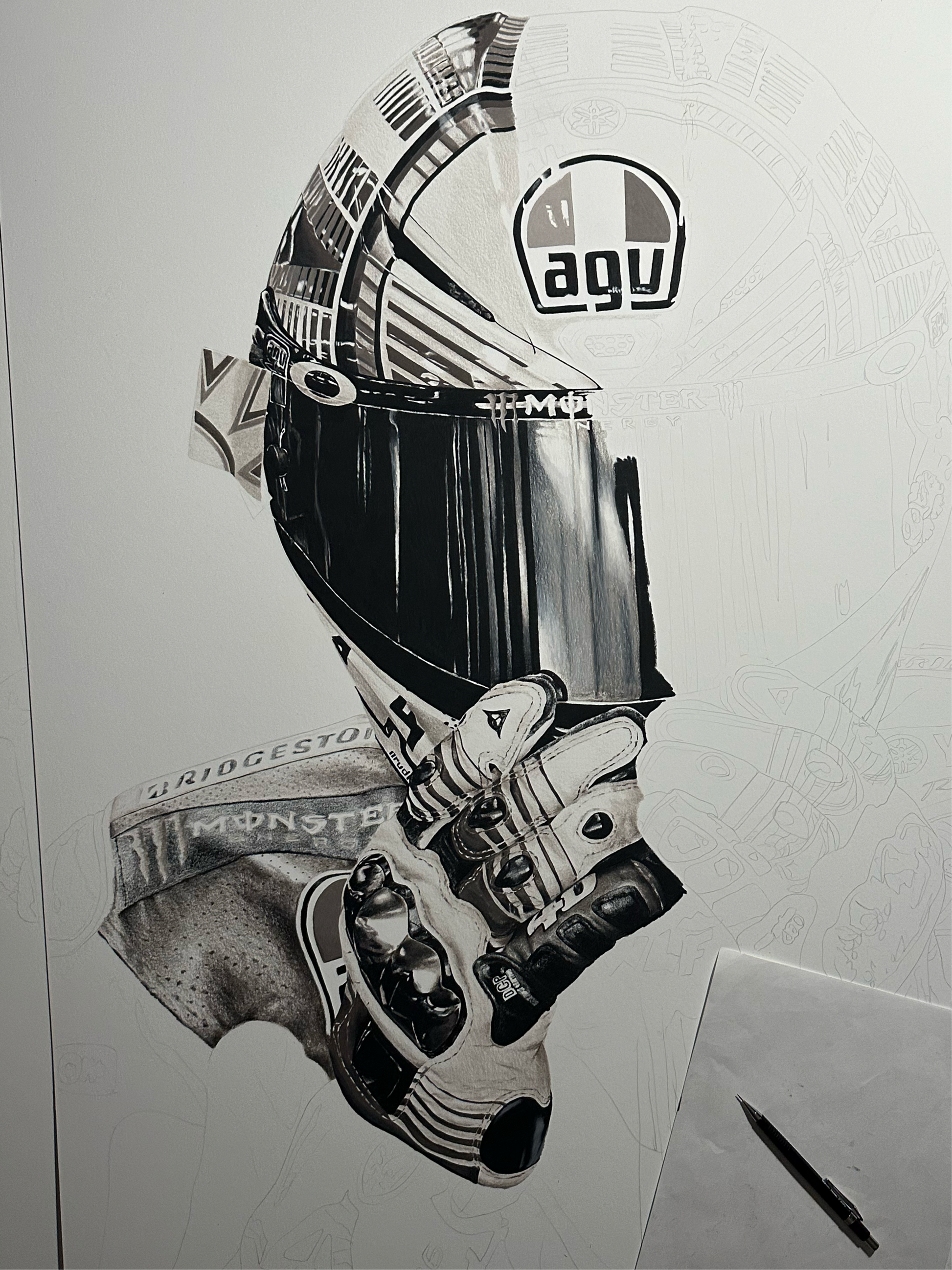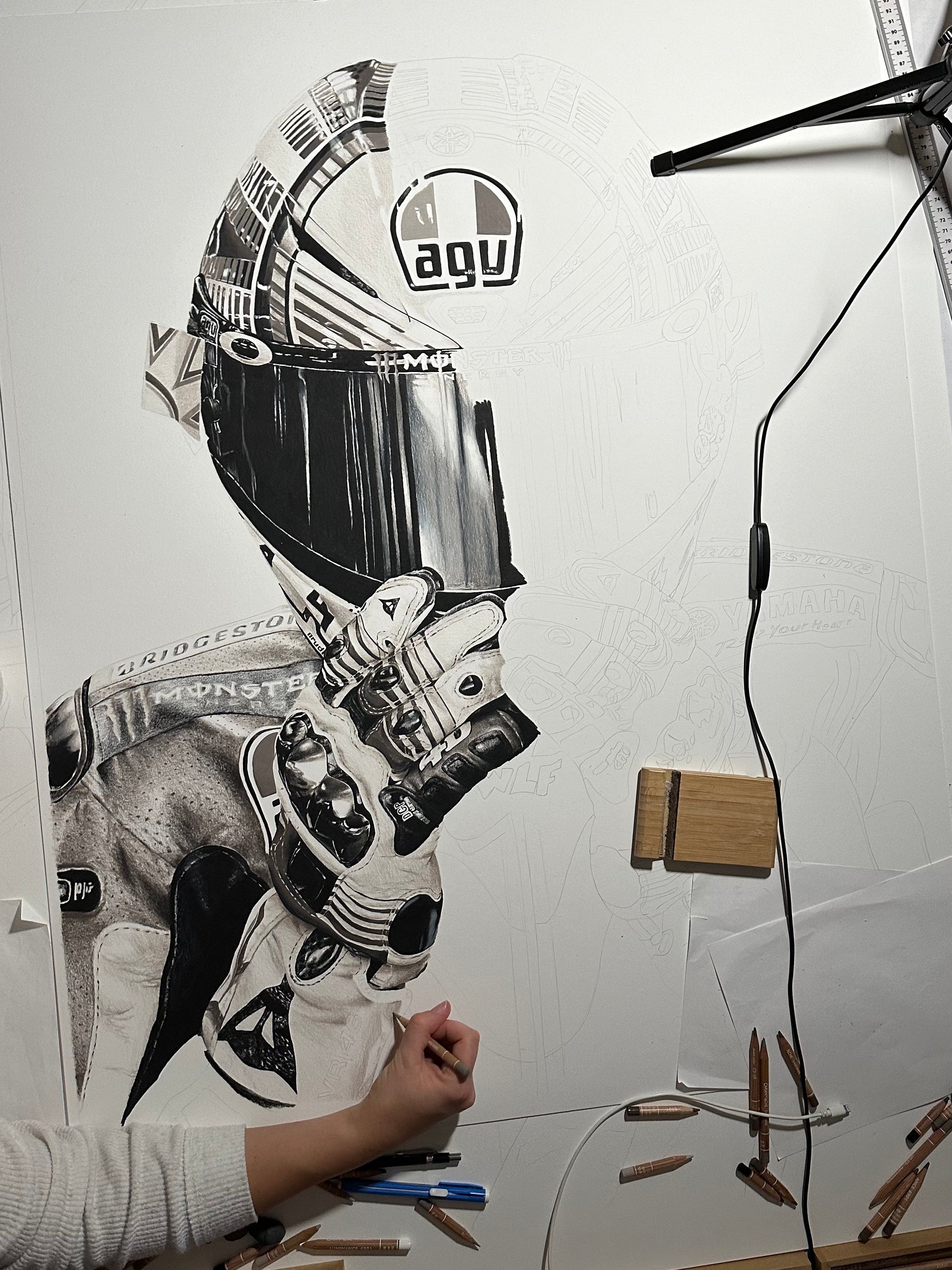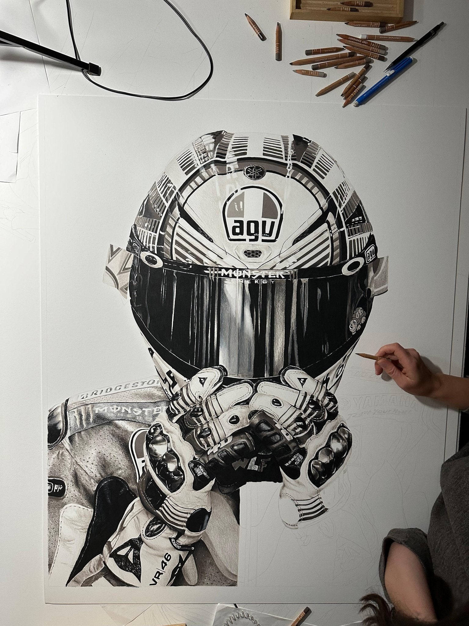 A Giclée Fine-Art Print of Emma's colour pencil drawing of motorcycle racing legend Valentino Rossi based on a photograph taken at Silverstone in 2015. Each limited edition print includes the artist signature, is numbered and comes with a certificate of authenticity.